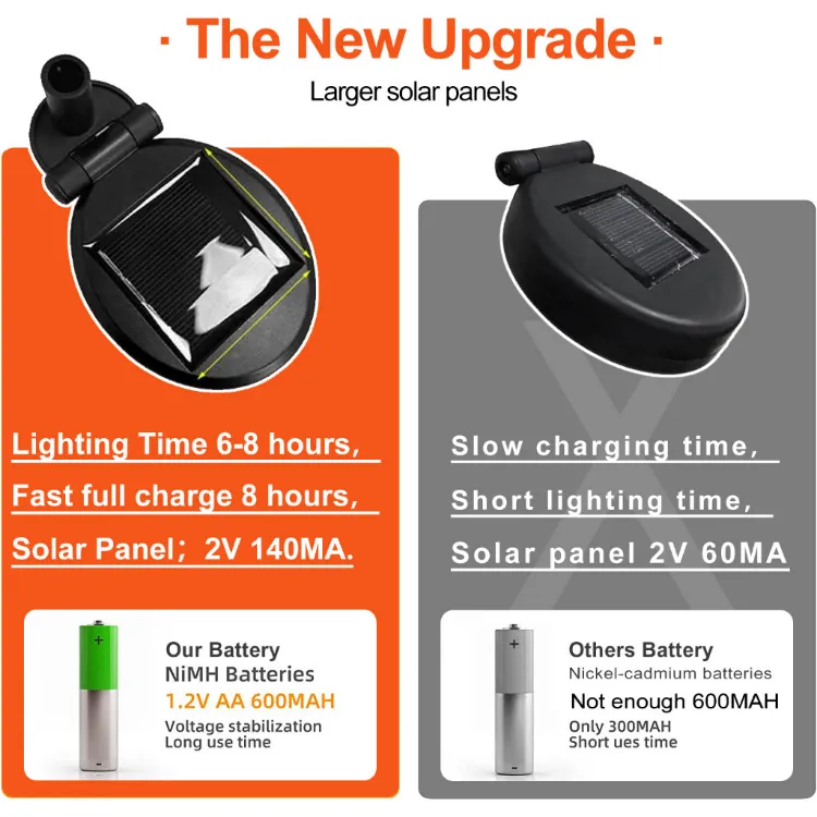 【Long Lasting & Energy Saving & High Efficiency】: Long Lasting with Larger Capacity Built-in Battery & Larger Size Solar Panel. Light up 12 hours after fully charged. Charging time: 8 hours under sunlight. Be sure the solar panel is in a sunny location– not in a shady area – and the solar panel faces the sun.